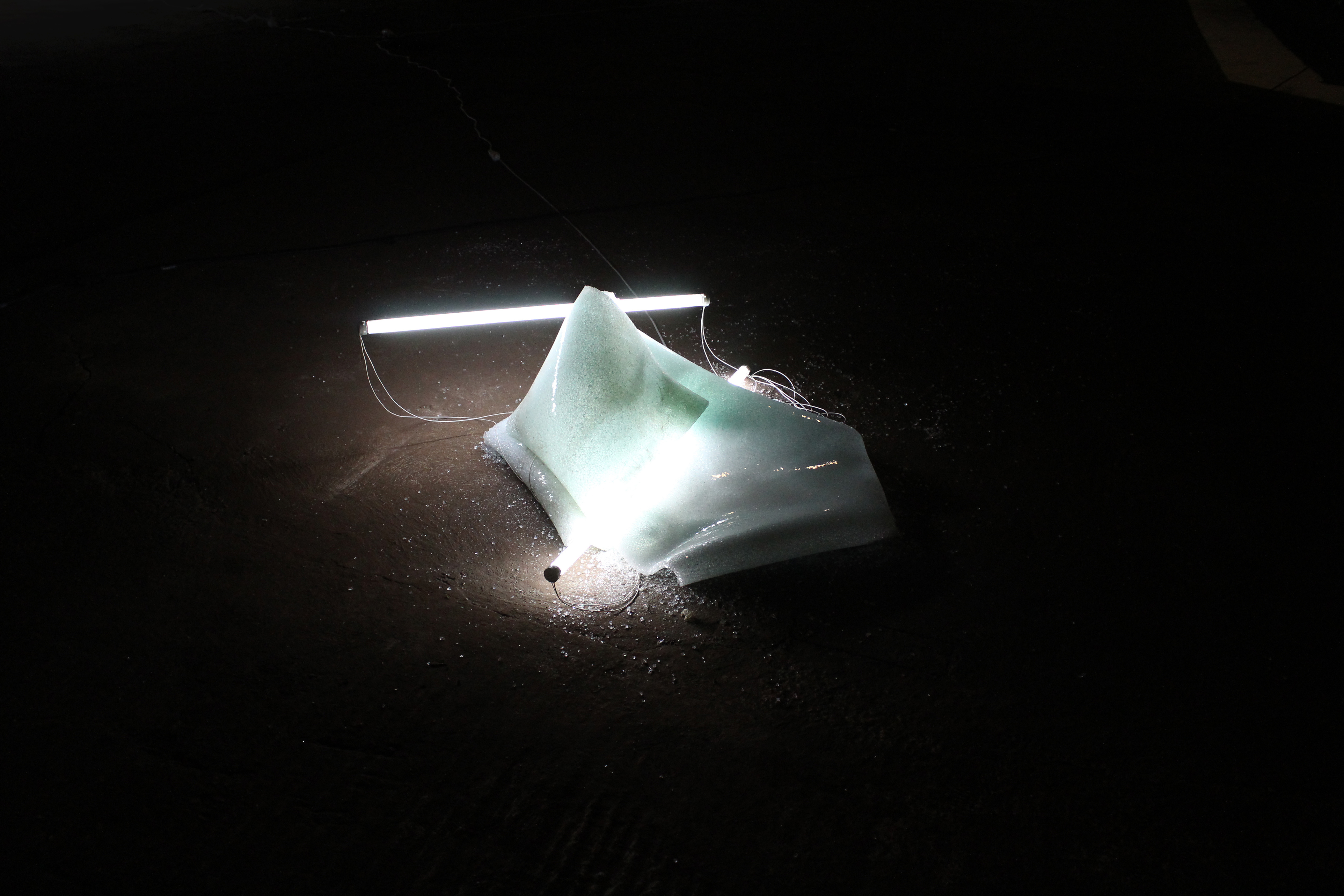 During the five months as a resident, I developed a certain sensibility to what was there when I arrived and what felt like is about to disappear, I wanted to preserve the objects I saw, physically and mentally. On the small body of work made of lights, dust, marble and metal shelves I’m describing a sensation of time, and the remaining memories when time is over."